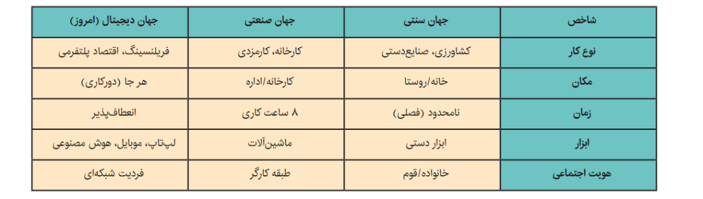 مطابق این رویکرد، کار در قالبِ الگوهای مدرن نظیر تاکسیهای اینترنتی، فریلنسینگ، متاورس، بلاک چِین و تولید محتوا نشان میدهد که مرز میان کار رسمی و غیررسمی در حال فروپاشی است. مطالعه و مقایسه جدول شماره (1) که به بررسی دادههای روز در عرصه تغییرات مداوم در الگوی مفهوم کار در گذار جهان سنتی- جهان صنعتی- جهان دیجیتال اشاره دارد، گویای این سیر تحول بنیادین است.