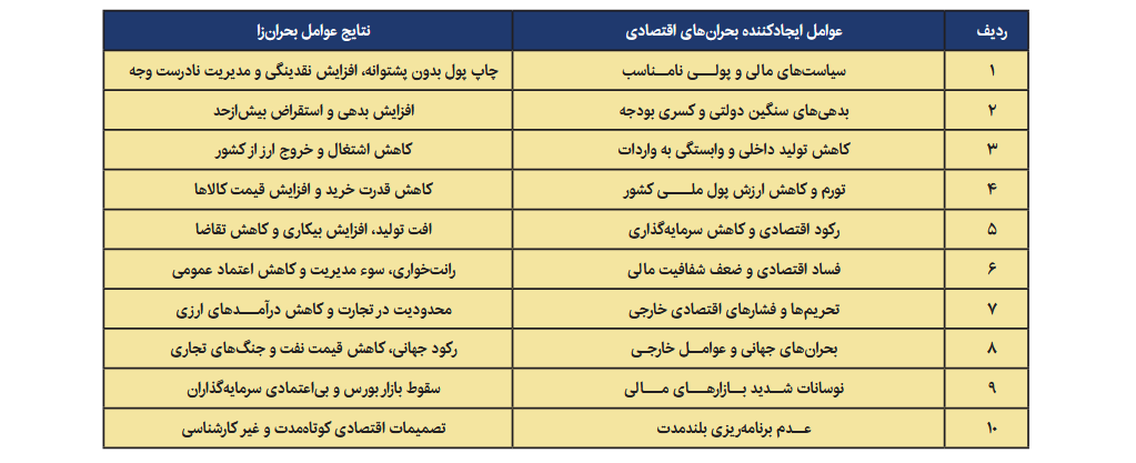جدول شماره (1): مهم‌ترین عوامل ایجادکننده بحران‌های اقتصادی