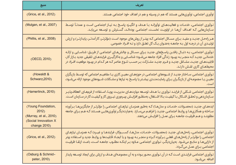 در جدول شماره (1) برخی از تعریفهای نوآوری اجتماعی درج شده است. تاکنون در مورد نوآوری اجتماعی تعریفهای متعددی ارائه شده است. با این حال هیچ توافق قطعی و مشترک در مورد اصطلاح نوآوری اجتماعی وجود ندارد و طیف وسیعی از تعریفها و تفسیرها در این مورد با توجه به تفاوتهای زبانی و شرایط و مقتضیات مختلف اجتماعی، اقتصادی، فرهنگی و نظایر آن وجود دارد.