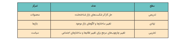 نوآوری اجتماعی میتواند در سه سطح اتفاق بیفتد. سطح اول نوآوری تدریجی در محصولات و خدمات برای تأمین نیازهای اجتماعی بهصورت کاراتر یا مؤثرتر است. این نوآوری هدف بسیاری از خیریهها و سازمانهای غیرانتفاعی و برخی بنگاههای تجاری موسوم به «کف هرم» است. از این نقطهنظر، نوآوری اجتماعی یک فرصت کسبوکار به حساب میآید. سطح دوم نوآوری نهادی است که هدف آن تغییر در ساختارهای اجتماعی و اقتصادی موجود برای تولید ارزش و نتایج اجتماعی جدید است. در نمونهای مانند بانكداری از طریق تلفن همراه، ساختارهای بازار موجود برای ایجاد ارزش جدید اجتماعی بهبود یافتهاند. در نهایت هدف نوآوری اجتماعی مخرب تغییر در سیستم است. این نوع نوآوری در جهان جنبشهای اجتماعی و بازیگران، گروهها و شبکههای سیاسی و با هدف تغییر در روابط قدرت، تغییر هرم اجتماعی و تغییر چارچوب موضوعات برای بهبود زندگی گروههای حاشیهنشین اتفاق میافتد. مشخصه نوآوری اجتماعی مخرب، مشارکت ساختاریافته در مجامع سیاستی یا طرحهای عضویت رسمی در جنبشهای اجتماعی است. کارآفرینان سیاستی میتوانند با تمرکز بر تحول مردمسالارانه و افزایش نقش شهروندی در تصمیمگیری، نوآوری اجتماعی مخرب را در ساختار حاکمیت پیادهسازی کنند. این سطوح در جدول شماره (2) دیده میشود.