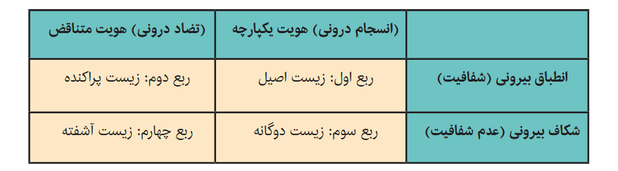 • محور افقی (انسجام درونی): میزان ثبات و یکپارچگی نظام ارزشی و هویتی فرد را می‌سنجد. این محور از «انسجام بالا» (خودِ تعریف‌شده و باثبات) تا «تضاد درونی/ انسجام پایین» (خودِ تکه‌تکه و سردرگم) متغیر است.