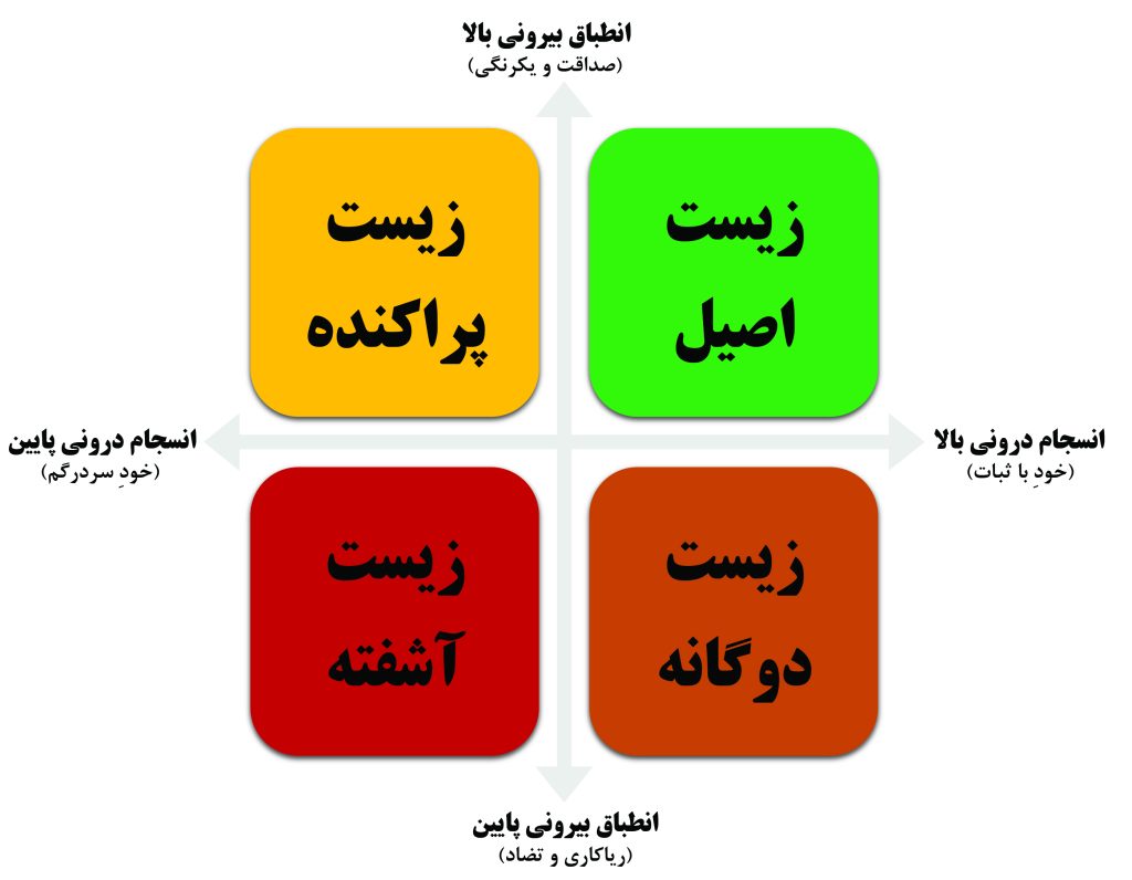 • محور عمودی (انطباق بیرونی): میزان هماهنگی میان رفتار بیرونی (عمل) و باورهای درونی (نظر) را نشان می‌دهد. این محور از «انطباق بالا» (صداقت و یکرنگی) تا «شکاف بیرونی/ انطباق پایین» (ریاکاری و تضاد) را در برمی‌گیرد.